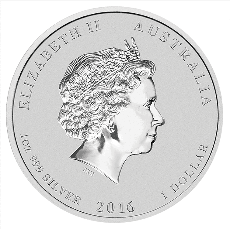 Features the Ian Rank-Broadley effigy of Queen Elizabeth II, with inscriptions: “ELIZABETH II,” “AUSTRALIA,” year “2016,” weight, purity, and denomination