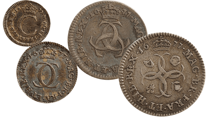 We have these sets from the reign of Charles II that have silver groat/fourpence, threepence, twopence and penny and are all dated. The King’s bust faces right with 'c' on the reverse interlocking representing the value of each coin. The coins are dated and in fine/very fine condition.