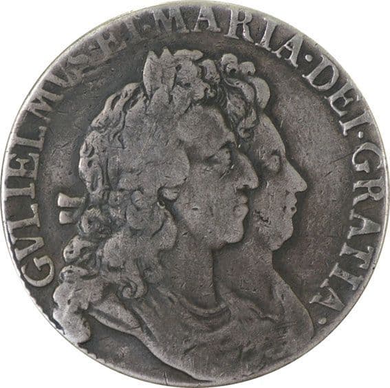 - Obverse: The coin features the conjoined busts of King William III and Queen Mary II, facing right. This design is unique as it is the only British coin to depict conjoined busts. The inscription around the edge reads "GVLIELMVS.ET.MARIA.DEI.GRATIA," which translates to "William and Mary by the Grace of God".